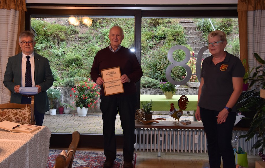 Anlässlich seines 80. Geburtstages wurde Horstmar Kuhn mit der Verdienstnadel in Gold mit Brillanten, großem Kranz und Urkunde durch den Kreisvorsitzenden des BLSV, Adolf Zerr, ausgezeichnet.